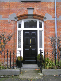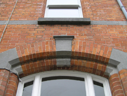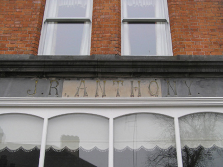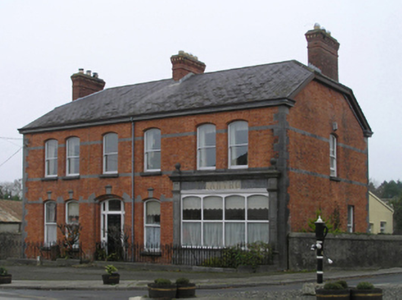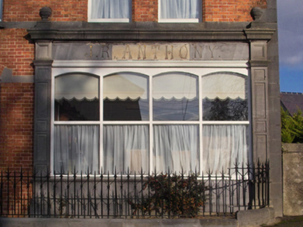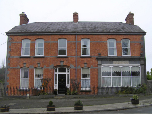 Detached four-bay two-storey house, extant 1901, on a rectangular plan with shopfront to right ground floor; four-bay two-storey rear (north) elevation. Hipped gabled slate roof with clay ridge tiles extending into pressed iron ridge, red brick Running bond chimney stacks centred on red brick Running bond chimney stack having stringcourse below dentilated corbelled stepped capping supporting terracotta or yellow terracotta pots, and replacement uPVC rainwater goods on iron-covered ragged cut-limestone eaves retaining cast-iron downpipes. Red brick Flemish bond walls with drag edged cut-limestone flush quoins to corners; rendered surface finish to rear (north) elevation. Camber-headed off-central door opening with drag edged tooled cut-limestone step threshold, bull nose-detailed timber mullions, and red brick voussoirs having chamfered rebated reveals centred on drag edged dragged cut-limestone keystone framing timber panelled door having sidelights on panelled risers below overlight. Paired square-headed window openings centred on square-headed window openings with drag edged cut-limestone sills, and red brick voussoirs having chamfered reveals centred on drag edged dragged cut-limestone keystones framing one-over-one timber sash windows. Dragged cut-limestone shopfront to right ground floor. Square-headed (east) or paired square-headed (west) window openings to rear (north) elevation with drag edged cut-limestone sills, and concealed dressings framing one-over-one timber sash windows. Road fronted on a corner site with drag edged cut-limestone chamfered plinth to perimeter supporting wrought iron railings.