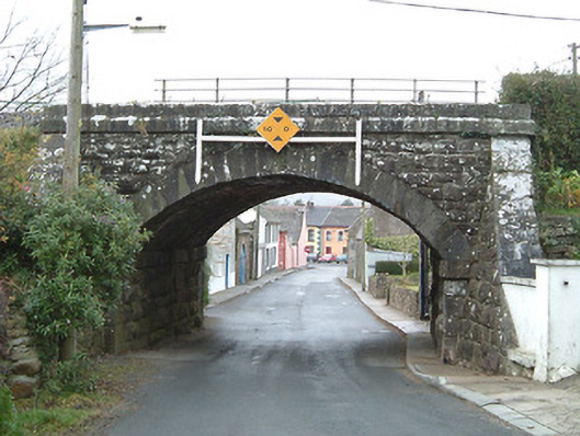 Single-arch railway bridge over road, opened 1853. Coursed rock-faced cut-limestone walls with buttresses having cut-limestone coping, and cut-limestone stringcourse supporting cut-limestone blocking course with sections of replacement steel railings, c.1975, over. Single segmental arch resting on tooled cut-limestone course with tooled limestone ashlar voussoirs, and squared rubble stone soffits. Sited spanning road.