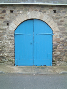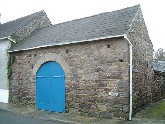 Attached single-bay single-storey outbuilding, c.1850, with segmental-headed carriageway. Pitched slate roof with clay ridge tiles, and replacement iron rainwater goods on squared rubble stone eaves. Random rubble stone walls with square apertures to eaves level. Segmental-headed carriageway with cut-granite voussoirs, and timber boarded double doors. Road fronted with concrete footpath to front.