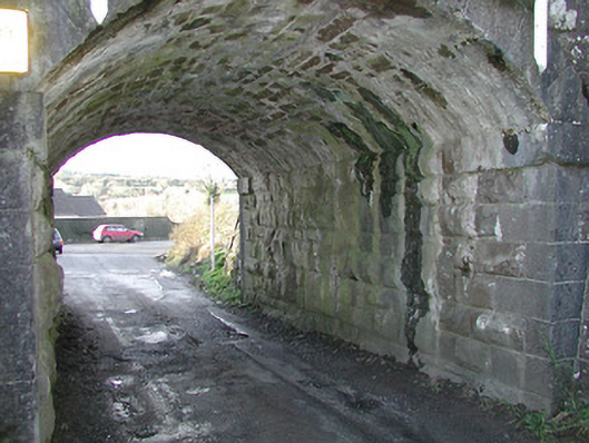 Single-arch cut-limestone railway bridge over road, opened 1853. Coursed rock-faced cut-limestone walls (including to tapered buttressed abutment walls) with cast-iron tie plates, and cut-limestone coping to parapets supporting replacement steel railings. Single segmental arch with limestone ashlar stringcourse to spring of arch, cut-limestone voussoirs, and squared rubble stone soffits having remains of render over. Sited spanning road with random rubble stone retaining walls to banks having rubble stone coping.