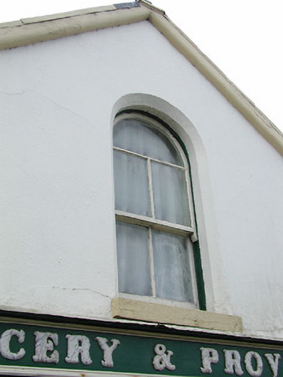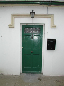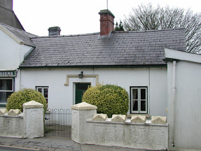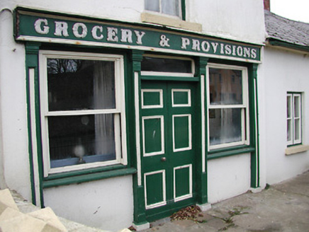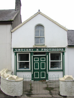 Attached four-bay single-storey double-pile house with half-dormer attic, c.1875, comprising three-bay single-storey double-pile range with single-bay single-storey gable-fronted flush end bay to left having shopfront to ground floor. Reroofed. Now disused to left ground floor. Pitched double-pile (M-profile) roofs (gabled to end bay) with replacement artificial slate, clay ridge tiles, red brick Running bond and rendered chimney stacks, rendered coping to gable having finial to apex, and cast-iron rainwater goods on rendered eaves. Painted rendered wall to front (north-east) elevation with painted roughcast walls to remainder. Square-headed window openings with cut-stone sills, and timber casement windows. Round-headed window opening to gable to end bay with cut-stone sill, and two-over-two timber sash window having overlight. Square-headed door opening with hood moulding over, and timber panelled door having overlight. Timber shopfront to end bay on a symmetrical plan with panelled pilasters, one-over-one timber sash windows, timber panelled double doors having overlight, and fascia over having raised lettering. Set back from line of road with painted rendered boundary wall having roughcast panels, rendered gabled 'battlements', iron gate, and diagonal piers having iron gate. (ii) Detached three-bay single-storey outbuilding, c.1875, to north with square-headed carriageway to centre. Pitched slate roof with clay ridge tiles, rendered coping, and cast-iron rainwater goods on rendered eaves. Painted roughcast walls. Square-headed window openings with stone sills, and timber fittings. Square-headed carriageway to centre with timber boarded double doors.
