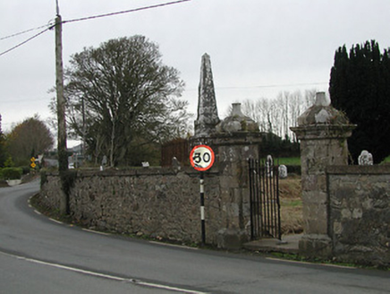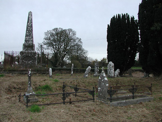 Freestanding limestone ashlar burial monument, c.1800, comprising plinth on a square plan with panels having oval mouldings, and moulded coping rising to panelled pedestal having obelisk over, all surrounded by sections of wrought iron railings. Set in grounds shared with Fiddown Church.