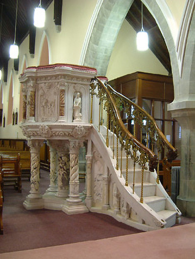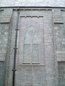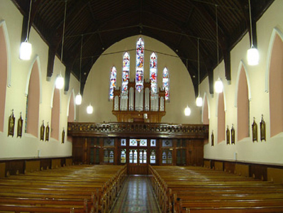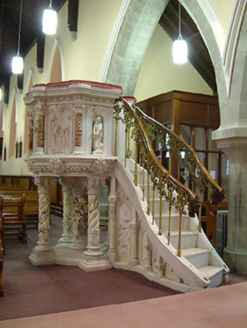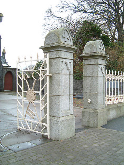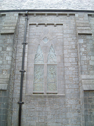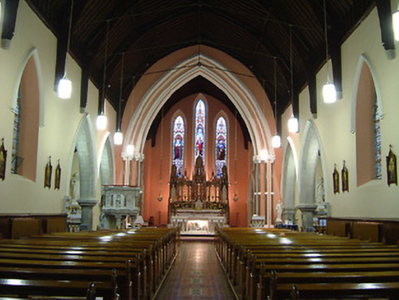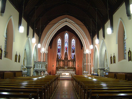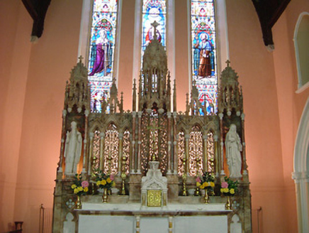 Detached seven-bay double-height Gothic Revival Catholic church, built 1869, on a corner site comprising six-bay double-height nave with single-bay (two-bay deep) double-height lean-to shallow transepts to north and to south, and single-bay double-height lower chancel to west having single-bay single-storey lean-to sacristy to south-west. Pitched slate roofs (lean-to to transepts and to sacristy) with section of polygonal 'fish scale' slate, clay ridge tiles, cut-limestone coping to gables having cross finials to apexes, and cast-iron rainwater goods on limestone ashlar eaves having corbels. Random squared limestone walls with cut-limestone dressings including quoins to stepped buttresses, and unpainted rendered walls to rear (west) elevations. Paired pointed-arch window openings in square-headed corbelled recesses with quatrefoil over, cut-limestone sills having chamfered reveals, limestone ashlar block-and-start surrounds, and fixed-pane fittings having leaded stained glass panels. Grouped (five part arrangement) lancet-arch window openings to east with limestone ashlar block-and-start surrounds, cut-limestone voussoirs, and fixed-pane fittings having leaded stained glass panels. Pointed-arch door opening with limestone ashlar block-and-start surround having moulded reveals, cut-limestone voussoirs, timber panelled double doors having sidelights on panelled risers, overlights having leaded stained glass panels, and squared limestone voussoirs over forming pointed-arch relieving arch. Full-height interior open into roof with glazed timber panelled internal porch having timber panelled gallery over, decorative clay tiled floor to aisle, timber pews, tongue-and-groove timber panelled wainscoting, moulded archivolts to window openings, pointed-arch arcades to transepts on cut-stone piers, exposed timber roof construction on cut-stone corbels, decorative cut-stone lectern on a polygonal plan, pointed-arch chancel arch with moulded reveals supporting archivolt resting on Corinthian colonettes, and decorative Gothic-style reredos. Set back from line of road on a corner site. (ii) Gateway, built 1869, to east comprising pair of granite ashlar trefoil panelled piers with moulded necking, pointed-arch capping, wrought iron double gates, wrought iron flanking pedestrian gates, granite ashlar trefoil panelled outer piers with moulded necking, pointed-arch capping, sections of wrought iron railings on granite ashlar plinth leading to granite ashlar trefoil panelled terminating piers having moulded necking, and pointed-arch capping.