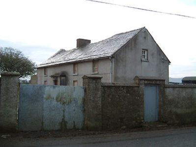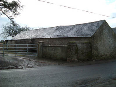 Detached four-bay two-storey farmhouse with dormer attic, c.1900, probably incorporating fabric of earlier ranges, pre-1840, on site with single-bay single-storey flat-roofed advanced porch to ground floor. Now disused. Pitched slate roof with clay ridge tiles, rendered chimney stack, rendered coping, and cast-iron rainwater goods on rendered eaves. Flat concrete roof to porch with concrete blocking course over. Unpainted rendered walls. Square-headed window openings with concrete sills, and two-over-two timber sash windows (most now boarded-up). Square-headed door opening (now boarded-up). Set back from road in own grounds perpendicular to road with unpainted roughcast boundary wall over random rubble stone construction having chamfered coping, square-headed pedestrian opening having tongue-and-groove timber panelled door, and roughcast piers having iron double gates. (ii) Detached four-bay single-storey outbuilding, c.1900, probably incorporating fabric of earlier ranges, pre-1840, on site. Now disused. Pitched slate roof with clay ridge tiles, and no rainwater goods. Unpainted roughcast walls over random rubble stone construction. Square-headed openings with concealed dressings, and timber fittings.