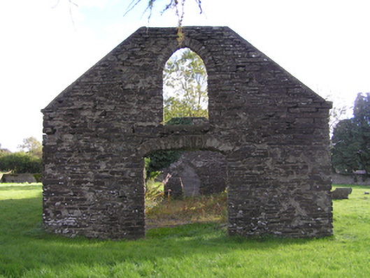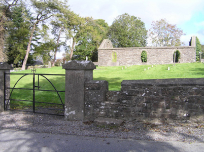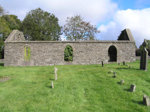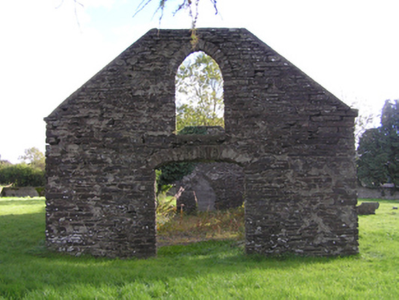 Detached three-bay single-storey single-cell Catholic chapel, extant 1839, on a rectangular plan. Disused, 1899. Now in ruins. Roof now missing. Part creeper- or ivy-covered rubble limestone battered walls with flush quoins to corners. Pointed-arch window openings with no fittings surviving. Camber-headed door opening (west) with no fittings surviving. Pointed-arch window opening (gable) with no fittings surviving. Interior in ruins. Set in landscaped grounds with rendered piers to perimeter having lichen-spotted gabled capping supporting wrought iron-detailed flat iron double gates.