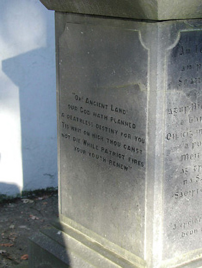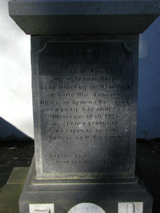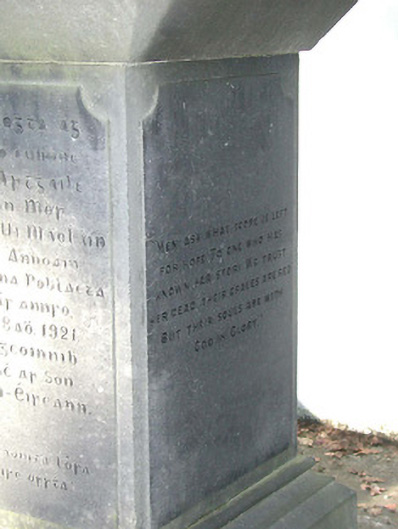 Freestanding limestone ashlar monument, dated 1921, comprising inscribed pedestal on a stepped base with chamfered necking supporting obelisk having cross finial. Road fronted with sections of iron railings on painted rendered plinth, iron gate, painted rendered panelled piers having stepped capping, and painted rendered boundary wall to enclosure.