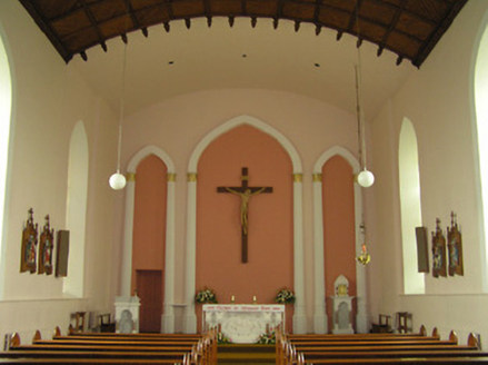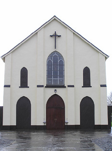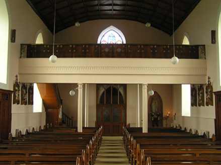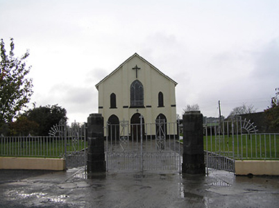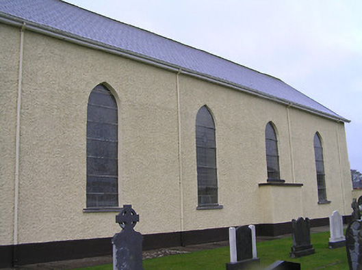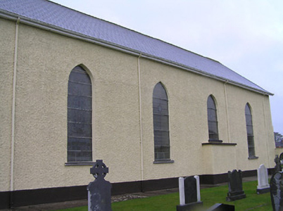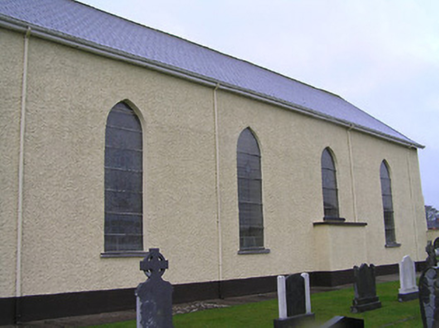 Detached four-bay double-height single-cell Catholic church, built 1832. Extensively renovated, post-1965. Pitched slate roof with clay ridge tiles, rendered bargeboards to gables, and iron rainwater goods on replacement timber eaves, post-1965. Painted rendered wall to front (north-east) elevation with rendered stepped buttresses, and painted replacement roughcast walls, post-1965, to remainder. Pointed-arch window openings with rendered sills, Y-mullions to front (north-east) elevation over entrance bay forming tripartite pointed-arch arrangement, and fixed-pane fittings having leaded stained glass panels. Pointed-arch door openings with replacement tongue-and-groove timber panelled double doors, post-1965, having overpanels. Full-height interior with glazed timber panelled internal porch, timber pews, timber panelled stepped gallery to first floor to north-east on clustered colonette pillars having timber panelled pews, Gothic-style reredos to chancel having fluted Corinthian columns on octagonal stepped pedestals supporting pointed-arch archivolts, and segmental barrel-vaulted diagonal tongue-and-groove timber panelled coffered ceiling. Set back from road in own grounds. (ii) Graveyard to site with various cut-stone markers, post-1832-present. (iii) Freestanding single-bay two-stage belfry, pre-1832, to west on a square plan probably originally bell tower of earlier church. Random rubble limestone walls with dressed limestone quoins to corners, square-headed slit-style apertures to first stage, cut-limestone stringcourse over, quatrefoil apertures to second stage, cut-stone stringcourse supporting battlemented parapet having cut-stone coping, and wrought iron railings surrounding cast-iron bell incorporating decorative bracket.