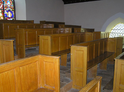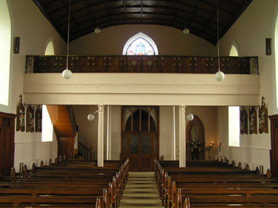 A well-composed middle-size church of modest architectural aspirations occupying an important position in the centre of Crosspatrick, thereby contributing significantly to the visual appeal of the area. Superseding an earlier chapel in the village the remains of which may survive to the present day in the form of a repositioned/reconstructed belfry the present church exhibits characteristics redolent of a period of construction shortly following Catholic Emancipation (1829) including a simple plan with minimal extraneous ornamentation: the frontispiece resulting from the application of pared-down Gothic details is comparable with the Catholic Church of Saint Kieran and Saint Michael (1831) in nearby Johnstown (12302002/KK-08-02-02) together with the Catholic Church of the Immaculate Conception (1845) in nearby Galmoy (12400301/KK-03-01) suggesting a common architect or builder. Having been well maintained the church presents an early aspect with most of the original composition attributes in place both to the exterior and to the interior where a range of features of artistic importance survive in place including carved timber joinery, delicate stained glass panels, and so on. An attendant graveyard containing markers displaying high quality craftsmanship enhances the setting value of the church in the landscape.