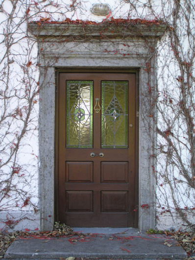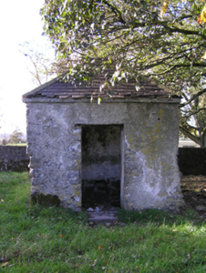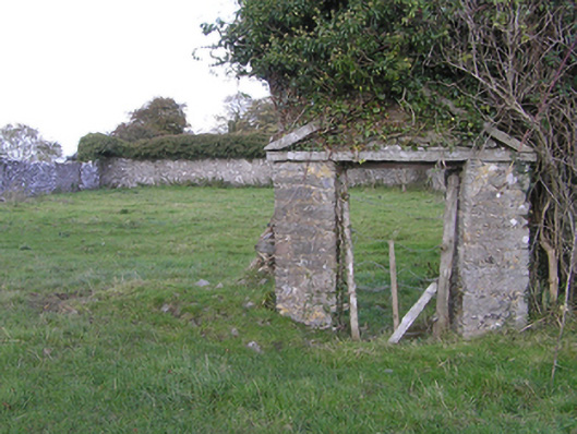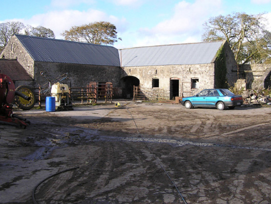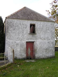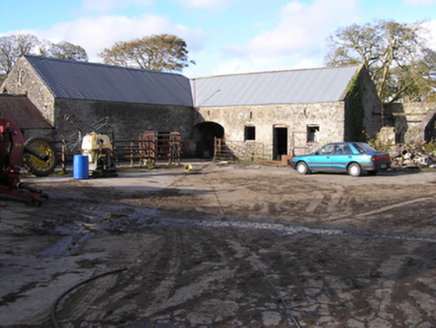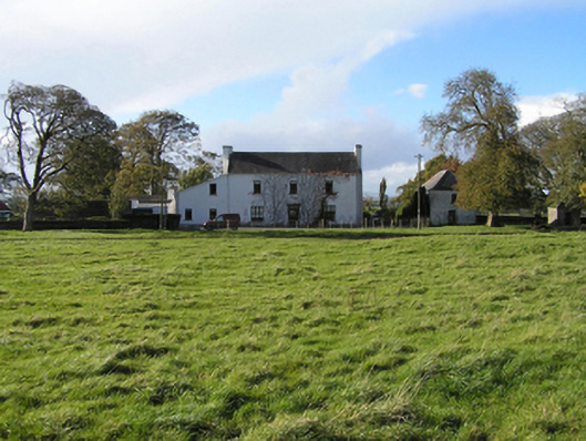 Detached three-bay two-storey farmhouse with dormer attic, extant 1814, on a rectangular plan. Occupied, 1901; 1911. Renovated, ----. Pitched slate roof with clay ridge tiles, concrete or rendered coping to gables, rendered chimney stack on a T-shaped plan (south) with rendered buttressed chimney stack (north), and replacement uPVC rainwater goods on rendered eaves. Part creeper- or ivy-covered rendered wall to front (east) elevation on rendered plinth; roughcast surface finish (remainder) with rusticated rendered piers to corners. Square-headed central door opening with cut-limestone threshold, and dragged cut-limestone surround with "Cyma Recta"- or "Cyma Reversa"-detailed cornice on blind frieze framing replacement glazed timber panelled door. Square-headed flanking window openings originally in tripartite arrangement with drag edged dragged cut-limestone sills, and concealed dressings framing replacement timber casement windows. Square-headed window openings (first floor) with drag edged dragged cut-limestone sills, and concealed dressings framing replacement timber casement windows. Paired square-headed window openings to rear (west) elevation centred on square-headed window openings with drag edged dragged cut-limestone sills, and concealed dressings framing replacement timber casement windows. Set in landscaped grounds.