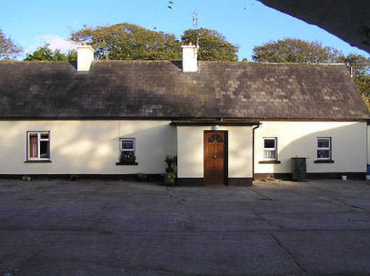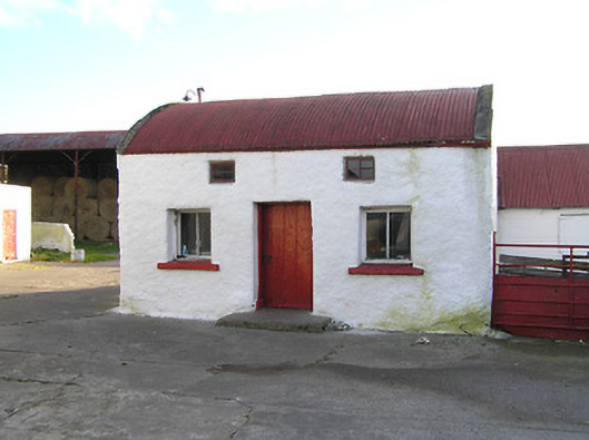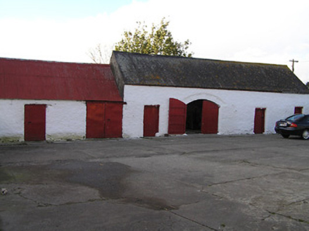 Detached five-bay single-storey farmhouse with dormer attic, c.1825, probably originally thatched. Renovated, c.1975, with single-bay single-storey flat-roofed projecting porch added. Refenestrated. Pitched slate roof with clay ridge tiles, rendered chimney stacks, and iron rainwater goods on timber eaves. Flat bitumen felt roof to porch with iron rainwater goods on timber eaves. Painted rendered walls. Square-headed window openings with rendered sills, and replacement uPVC casement windows having some replacement timber casement windows, c.1975, throughout. Square-headed door opening with replacement glazed timber panelled door. Set in own grounds perpendicular to road about a courtyard. (ii) Detached three-bay single-storey barrel-roofed outbuilding with half-attic, c.1900, to south. Reroofed, c.1975. Barrel-vaulted roof with painted replacement corrugated-iron, c.1975, rendered coping, and iron rainwater goods. Painted roughcast walls. Square-headed window openings with cut-stone sills (no sills to half-attic), and fixed-pane timber windows. Square-headed door opening with timber boarded door. (iii) Attached two-bay single-storey outbuilding, c.1900, to south-west with square-headed carriageway to right. Reroofed, c.1975. Pitched roof with painted replacement corrugated-iron, c.1975, iron ridge, and no rainwater goods. Painted roughcast walls. Square-headed door opening with timber lintel, and timber door. Square-headed carriageway to right with iron double doors. (iv) Attached four-bay single-storey outbuilding, c.1900, to west with segmental-headed carriageway. Pitched slate roof with clay ridge tiles, and no rainwater goods on rendered squared rubble stone eaves. Painted roughcast walls. Square-headed door openings with timber lintels, and timber boarded doors. Segmental-headed carriageway with rendered voussoirs, and timber boarded double doors.