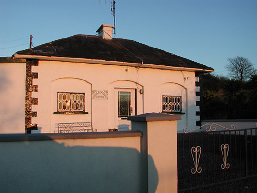 Detached three-bay single-storey gate lodge, extant 1900, on a rectangular plan. Hipped slate roof with clay ridge tiles centred on rendered chimney stack having concrete capping, and no rainwater goods surviving on rendered eaves. Rendered walls on rendered plinth with quoins to corners. Square-headed central door opening in camber- or segmental-headed recess with concealed dressings framing replacement glazed uPVC panelled door. Square-headed flanking window openings in camber- or segmental-headed recesses with cut-limestone sills, and concealed dressings framing casement windows having cast-iron glazing bars. Set back from line of road opposite entrance to grounds of Foulkscourt House.