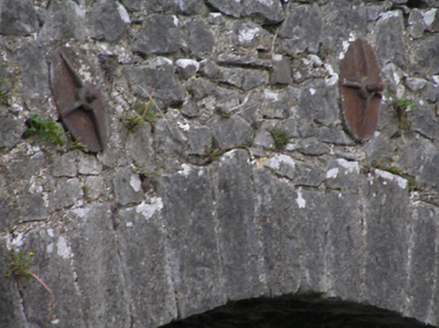 Five-arch rubble limestone road bridge over river, c.1775. Random rubble limestone walls with cut-limestone triangular cut-waters to piers having cut-limestone coping, cast-iron tie plates, pedestrian refuge on a shallow triangular plan, and squared rubble limestone coping to parapets. Series of five segmental arches with cut-limestone voussoirs, and rubble stone soffits having remains of render over. Sited spanning River Nore with grass banks to river.