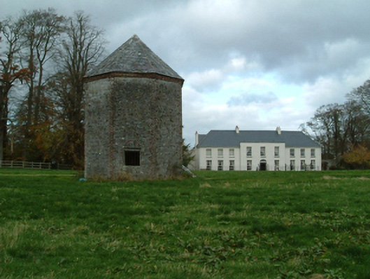 Freestanding single-bay two-stage dovecote, extant 1839, on an octagonal plan. Now disused. Octagonal slate roof with red brick header bond stepped eaves. Coursed rubble stone walls with red brick flush quoins to corners. Pair of square-headed door openings in shallow camber-headed recesses with red brick block-and-start surrounds framing diagonal timber boarded doors. Full-height interior on a circular plan with staggered pigeonholes having red brick header bond ledges. Set in landscaped grounds shared with Grange House.