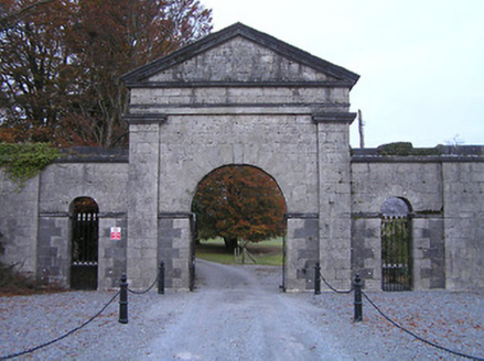 Triumphal gateway, built 1874, in tripartite arrangement comprising round-headed vehicular gateway in pedimented screen with tooled limestone ashlar walls, cut-granite block-and-start surround extending through carved cut-limestone stringcourse to spring of arch into granite ashlar voussoirs having keystone, iron double gates having spear-head finials, granite ashlar piers flanking parapet having moulded necking supporting frieze, pediment having carved surround, round-headed flanking pedestrian gateways with cut-granite block-and-start surrounds continuing through carved limestone stringcourse to spring of arch into granite ashlar voussoirs, iron gates having spear-head finials, cut-limestone cornice supporting blocking course, and granite ashlar terminating piers having cut-limestone cornices supporting blocking courses. Road fronted at entrance to grounds of Swifte's Heath.
