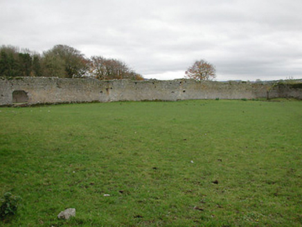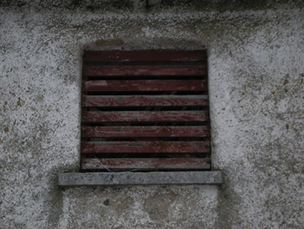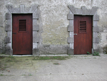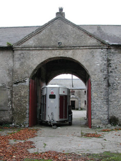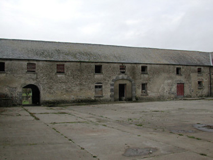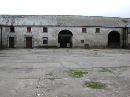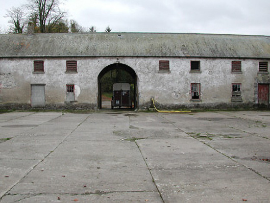 Farmyard complex, c.1750, including: (i) Detached thirty-bay two-storey outbuilding range on a quadrangular plan comprising seven-bay two-storey range to south with single-bay full-height pedimented breakfront having segmental-headed carriageway, seven-bay two-storey range to west with pair of (full-height) round-headed carriageways, eight-bay two-storey range to north with series of three elliptical-headed carriageways to ground floor, and eight-bay two-storey range to east. Hipped slate roofs on a quadrangular plan (gabled to breakfront) with clay ridge tiles, rendered chimney stacks, and cast-iron rainwater goods on slightly overhanging rendered eaves having iron brackets. Unpainted roughcast walls over random rubble stone construction with rendered surround to pediment to breakfront. Square-headed window openings with cut-limestone sills, and timber fittings including louvered panel fittings (some having wrought iron bars). Square-headed door openings with some having cut-limestone block-and-start surrounds incorporating elongated voussoirs, and timber boarded doors. Segmental-headed carriageway to breakfront with painted corrugated-iron double doors. Pair of full-height round-headed carriageways to range to west with concealed red brick voussoirs, and no fittings. Series of three elliptical-headed carriageways to range to north with cut-limestone block-and-start surround to centre ground floor, and no fittings. Set back from road in grounds originally shared with Woodsgift House. (ii) Freestanding cast-iron waterpump, c.1875, comprising banded cylindrical shaft with moulded necking supporting cylindrical head having spout, curvilinear 'cow tail' handle, and inscribed domed capping on profiled course having finial. (iii) Walled garden to west with random rubble limestone boundary wall to perimeter of site.