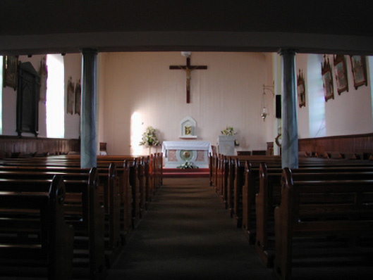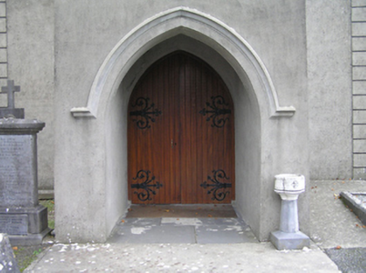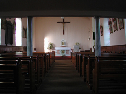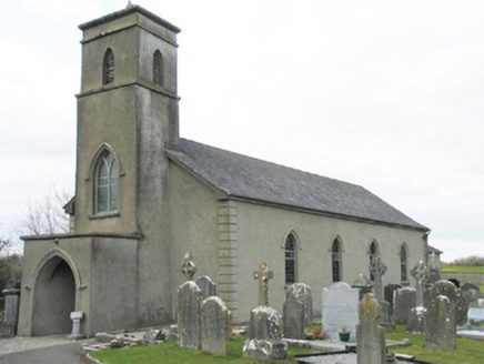 Detached four-bay double-height single-cell Catholic church, built 1817, on a rectangular plan; single-bay three-stage tower to entrance (south) front on a square plan with single-bay single-storey flat-roofed projecting open porch to ground floor. Renovated, ----, with sanctuary reordered. Replacement pitched artificial slate roof with lichen-spotted ridge tiles, slightly sproketed eaves, and cast-iron rainwater goods on rendered eaves retaining cast-iron downpipes. Replacement cement rendered battered walls with rusticated rendered piers to corners. Pointed-arch window openings with drag edged cut-limestone sills, and concealed dressings with hood mouldings framing fixed-pane fittings having stained glass margins centred on leaded stained glass roundels. Pointed-arch door opening (tower) with limestone flagged threshold, and concealed dressings with hood moulding framing timber boarded double doors. Pointed-arch window opening (second stage) with drag edged cut-limestone sill, Y-mullion, and concealed dressings with hood moulding framing storm glazing over fixed-pane fittings having stained glass margins centred on leaded stained glass roundels. Lancet openings (bell stage) with sill course, and concealed dressings framing louvered fittings. Full-height interior with balustraded choir gallery (south) on paired polished marble columns, carpeted central aisle between cruciform-detailed timber pews, timber boarded wainscoting with carved timber dado rail, paired Gothic-style timber stations between leaded stained glass windows (----), moulded plasterwork cornice to vaulted ceiling, and camber-headed chancel arch framing carpeted stepped dais to sanctuary (north) reordered, ----, with cut-white marble panelled altar. Set in landscaped grounds with rendered piers to perimeter having lichen-spotted shallow pyramidal capping supporting flat iron double gates.
