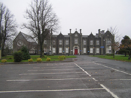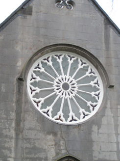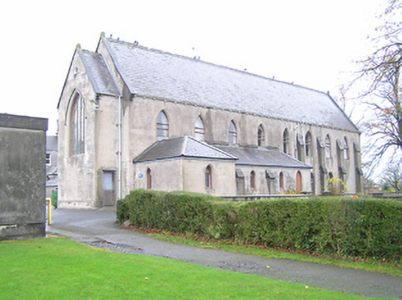 Attached eight-bay double-height Gothic-style Catholic chapel, c.1875, with single-bay single-storey chapels to north and to south having three-bay single-storey sacristy to south, single-bay double-height lower chancel to west, and single-bay two-storey lower linking bay to north-east having single-bay single-storey gabled projecting glazed porch. Refenestrated, c.1975. Now in use as centre. Pitched slate roofs (hipped to chapels, to sacristy, and to linking bay) with clay ridge tiles (decorative clay ridge tiles to nave), cut-limestone coping to gables, and cast-iron rainwater goods on rendered eaves having corbels. Pitched (gabled) glazed roof to porch in timber frame with decorative cresting to gable having cross finial to apex. Unpainted rendered, ruled and lined walls with rendered buttresses having cut-limestone coping. Pointed-arch window openings with cut-limestone flush sills, and replacement fixed-pane timber windows, c.1975, having casement sections. Pointed-arch window opening to chancel with cut-limestone flush sill, hood moulding over, chamfered reveals, mullions forming five-part trefoil-headed arrangement having decorative overlights, fixed-pane timber fittings having leaded stained glass panels, fixed-pane timber secondary (outer) glazing, c.1975, trefoil-window opening to gable having chamfered reveals, and replacement fixed-pane timber fitting, c.1975. Rose window to east with hood moulding over, mullions forming trefoil-headed openings centred on rosette, and fixed-pane fittings. Square-headed openings to porch with fixed-pane timber fittings, and fixed-pane overlight to gable. Set back from road in grounds shared with Saint Patrick's Centre.