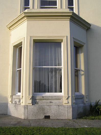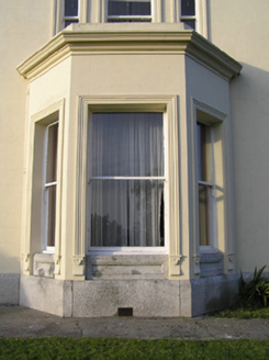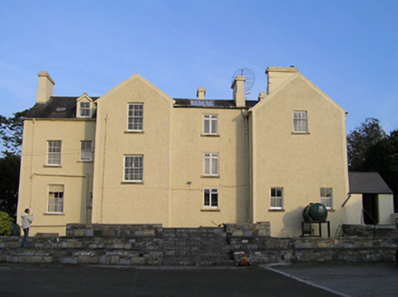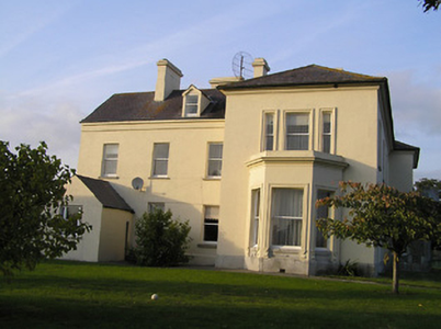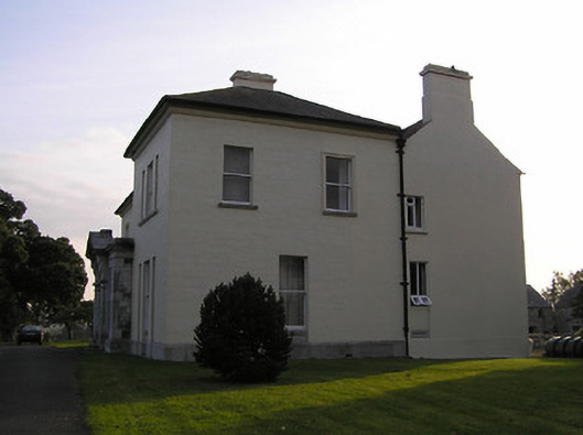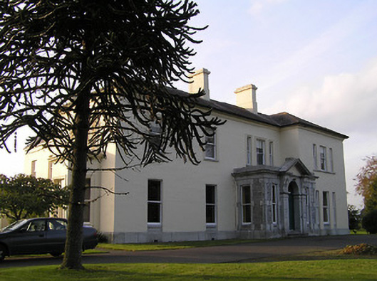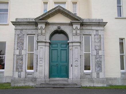 Detached four-bay two-storey Classical-style country house with dormer attic, c.1850, possibly over basement incorporating fabric of earlier house, c.1725, on site with three-bay single-storey flat-roofed projecting porch to ground floor, single-bay two-storey advanced end bay to right, single-bay two-storey side elevation having canted bay window to ground floor, four-bay two-storey range along rear (west) elevation having single-bay full-height gabled advanced bay, and three-bay two-storey return to south-west. Hipped slate roof on an L-shaped plan (pitched slate roof to parallel range continuing into return on an L-shaped plan; gabled to advance bay; gabled to dormer attic windows) with clay ridge tiles, rendered chimney stacks having moulded cornices, rooflights, and cast-iron rainwater goods on moulded rendered eaves. Painted rendered, ruled and lined walls on tooled cut-granite plinth with rock-faced dressed limestone walls to porch having cut-granite dressings including block-and-start quoins to corners incorporating bull-nose detailing, frieze on stringcourse, carved cornice, blocking course to parapet, and painted roughcast walls to rear (west) elevation having rendered strips to corners. Square-headed window openings (some in tripartite arrangement) with cut-granite sills (on cut-granite panelled risers to ground floor), moulded rendered surrounds (on consoles to canted bay window), and one-over-one timber sash windows having six-over-six timber sash windows to rear (west) elevation (some two-over-two timber sash windows throughout having eight-over-eight timber sash window to advanced bay). Round-headed door opening to porch on two cut-granite steps with cut-granite panelled pilaster doorcase having moulded necking, paired consoles supporting open-bed pediment, bull-nose reveals to door opening, timber panelled double doors having overlight, square-headed flanking window openings on cut-granite panelled risers having block-and-start surrounds, chamfered reveals, and one-over-one timber sash windows. Interior with timber panelled shutters to window openings. Set back from road in own grounds with tarmacadam forecourt, and landscaped grounds to site.