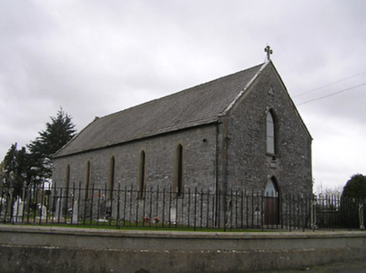 Detached five-bay double-height single-cell Catholic church, dated 1859, possibly incorporating fabric of earlier Catholic chapel, pre-1840, on site with single-bay single-storey lean-to sacristy to south. Renovated, pre-1963. Pitched slate roof (lean-to to sacristy behind parapet) with clay ridge tiles, cut-limestone coping to gables having cross finial to apex, and cast-iron rainwater goods on cut-limestone eaves. Random rubble limestone walls (originally rendered with render removed, pre-1963, surviving in fragment to south) with dressed limestone quoins to corners, cut-limestone date stone/plaque, red brick voussoirs forming elliptical relieving arches (possibly to accommodate proposed additional openings), cut-limestone panel to gable having trefoil moulding, rendered band over, and rendered coping to parapet to sacristy having rendered gabled bellcote over (with pointed-arch aperture having cast-iron bell, and rendered coping having cross finial to apex). Pointed-arch window openings with cut-limestone sills, rendered, ruled and lined surrounds having chamfered reveals, and fixed-pane timber fittings having leaded stained glass panels. Pointed-arch door opening with cut-limestone surround, and replacement tongue-and-groove timber panelled double doors having overlight. Full-height interior with timber pews, timber panelled gallery to first floor to north on clustered colonette pillars, and Gothic-style reredos to chancel (with engaged clustered colonette piers (some paired) on panelled pedestals with panelled dosserets flanking Gothic-style archivolts). Set back from road in own grounds with unpainted rendered panelled piers having profiled stringcourse cornices supporting rendered capping, iron double gates, and iron flanking pedestrian gates. (ii) Graveyard to site with various cut-stone markers, pre-1840-present.