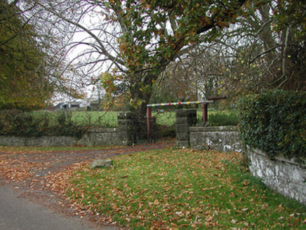 Gateway, c.1900, comprising pair of rusticated cut-limestone piers with iron double gates, and random rubble limestone curved flanking walls having cut-limestone coping. Road fronted at entrance to grounds of Burnchurch House.