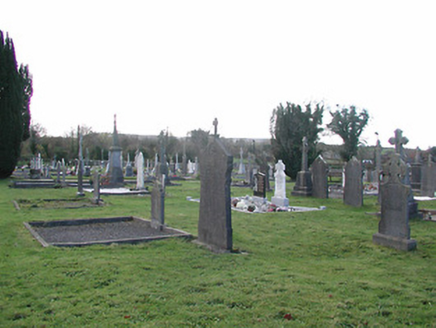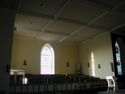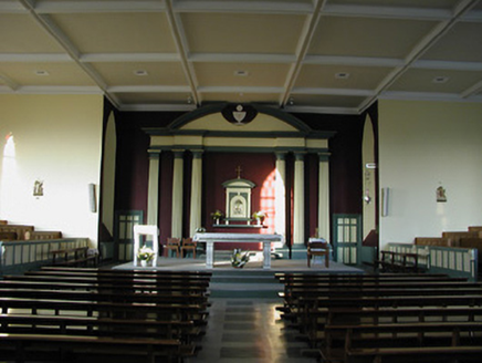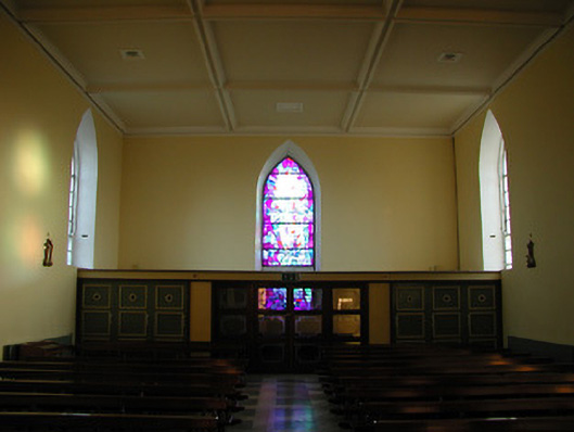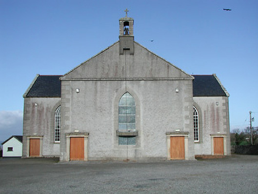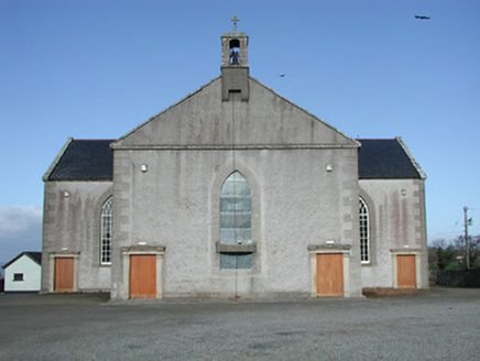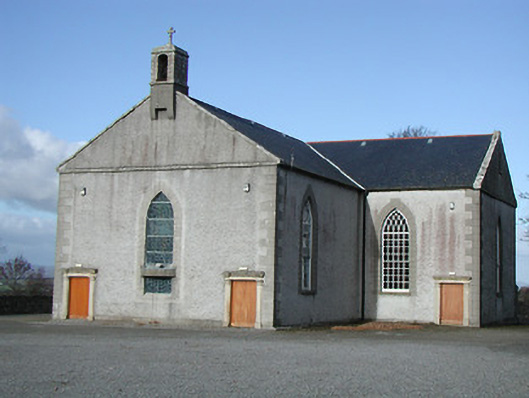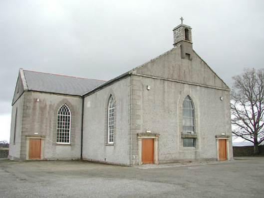 Detached three-bay double-height Catholic church, c.1825, on a cruciform plan comprising single-bay double-height nave, single-bay double-height transepts to east and to west, and single-bay double-height shallow chancel to north continuing into single-bay two-storey double-pile sacristy to north. Pitched slate roofs on a cruciform plan (pitched double-pile (M-profile) to sacristy) with clay ridge tiles, cut-limestone coping to gables having bellcote, dated 1865, to apex to south (with limestone ashlar 'machicolation' supporting stringcourse, camber-headed aperture having cast-iron bell, and cut-limestone coping having cross finial), and cast-iron rainwater goods on cut-limestone eaves. Unpainted roughcast walls with cut-limestone quoins to corners, and cut-limestone surround to gable. Pointed-arch window openings with cut-limestone sills, rendered quoined surrounds incorporating voussoirs having 'keystones', and twenty-over-twenty timber sash windows having tracery overlights (fixed pane fitting to south having leaded stained glass panels). Square-headed door openings with cut-granite pilaster surrounds supporting friezes having entablatures, and tongue-and-groove timber panelled doors. Square-headed window openings to sacristy with cut-limestone sills, rendered surrounds, six-over-six (ground floor) and three-over-six (first floor) timber sash windows having wrought iron bars. Square-headed door opening with four cut-stone steps, rendered surround, and timber door. Full-height interior reordered, post-1973, with glazed internal porch (incorporating glazed timber double doors having sidelights) having timber panelled flanking confessionals, timber pews, timber panelled pews to transepts having timber panelled parapet screen incorporating Acanthus console accents, Classical-style reredos to chancel (with paired full-height fluted Doric columns flanking aedicule (with sill on consoles, pilasters flanking round-headed recess, frieze, and segmental pediment having cross finial) having full-height fluted flanking Doric pilasters supporting entablature, frieze, cornice, and broken segmental pediment), replacement altar fittings, post-1973, and coffered ceiling. Set back from road in own grounds. (ii) Graveyard to site with various cut-stone markers, c.1825-present.
