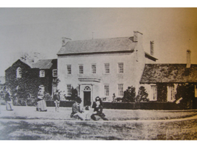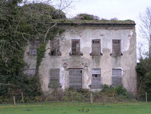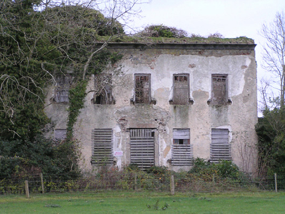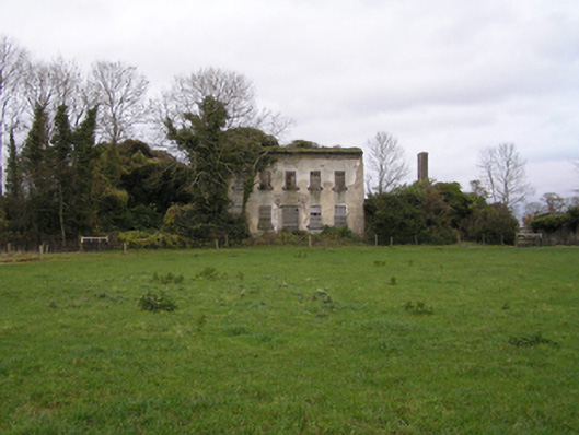 Detached five-bay two-storey over basement country house with half-dormer attic, built 1748, on a rectangular plan originally centred on single-bay single-storey flat-roofed projecting porch to ground floor. Occupied, 1901; 1911. Derelict, 1969. In ruins, 1993. Pitched roof now missing with no rainwater goods surviving on slightly overhanging slate flagged eaves on dragged cut-limestone "Cyma Recta" or "Cyma Reversa" cornice. Part creeper- or ivy-covered lime rendered or roughcast walls. Square-headed central door opening into country house with overgrown threshold, and concealed dressings including red brick voussoirs framing boarded-up fittings. Square-headed window openings with drag edged dragged cut-limestone sills now missing, and concealed dressings including red brick voussoirs framing boarded-up six-over-six timber sash windows without horns having part exposed sash boxes. Interior in ruins. Set in unkempt grounds with lichen-spotted piers to perimeter having stringcourses below capping supporting spear head-detailed wrought iron double gates.
