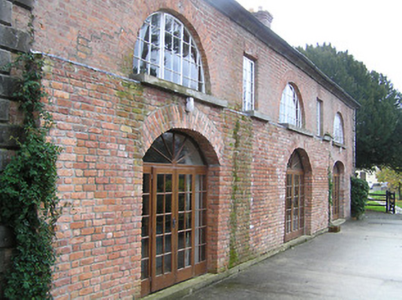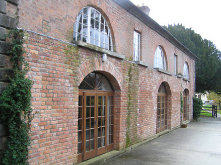 Detached seven-bay two-storey double-pile red brick outbuilding, c.1775, with two-bay single-storey recessed end bay to left, and five-bay two-storey rear (north-west) elevation having series of three segmental-headed carriageways to ground floor. Renovated, c.1975, to accommodate residential use. Pitched double-pile (M-profile) and hipped slate roof on a U-shaped plan (pitched to end bay) with clay ridge tiles, red brick Running bond chimney stack having stepped coping, red brick stepped 'bargeboards' to gables, and cast-iron rainwater goods on limestone ashlar concave eaves. Red brick Flemish bond walls on cut-limestone plinth with limestone ashlar dressings including quoins to corners, and concave band to eaves. Square-headed window openings (in bipartite arrangement to ground floor; Diocletian window openings to first floor rear (north-west) elevation) with cut-limestone sills, red brick voussoirs, and replacement timber casement windows, c.1975, retaining some four-over-four timber sash windows to ground floor having fifteen-over-fifteen timber sash windows to first floor (fixed-pane timber windows to Diocletian openings possibly having casement sections). Grouped (three-part arrangement) square-headed door openings with red brick voussoirs, replacement glazed timber double doors, c.1975, having overlights, and replacement timber panelled doors, c.1975, to flanking openings having overlights. Series of three segmental-headed carriageways to ground floor rear (north-west) elevation with red brick voussoirs, replacement glazed timber double doors, c.1975, having sidelights, and fanlight. Set back from road in grounds shared with Belline House.