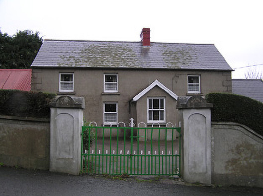 Detached four-bay single-storey lobby entry farmhouse with half-dormer attic, built 1926, on a rectangular plan with single-bay single-storey gabled projecting porch. Pitched slate roof with ridge tiles, red brick Running bond chimney stack having stringcourse below dentilated capping, and cast-iron rainwater goods on rendered eaves with cast-iron downpipes; pitched (gabled) slate roof (porch) with ridge tiles, timber bargeboards, and no rainwater goods on timber box eaves. Rendered, ruled and lined walls with rusticated rendered quoins to corners. Square-headed window opening (porch) with rendered sill, and concealed dressings framing three-over-three timber sash window having exposed sash box. Square-headed window openings with concrete sills, and concealed dressings framing one-over-one timber sash windows. Set back from line of road with rendered panelled piers to perimeter having segmental capping supporting wrought iron-detailed flat iron double gates.