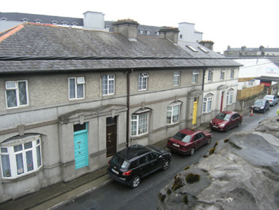 Mid-terrace two-bay two-storey, stripped classical style house built c. 1940, with advanced entrance porch. Low pitched slate roof with overhanging eaves, clay ridge tiles, tall rendered stack on party wall, moulded cast-iron rainwater goods, U profile gutters and square downpipes. Ruled and lined ashlar effect render to ground floor and roughcast render upper storey, ground floor canted bay window recessed under segmental-arch, square-headed windows to upper storey, and square-headed door with rectangular fanlight, tall plinth course under a plat band continuous with sill level and broken by entrance door, plat band with drop key stones above ground floor openings and plat band under upper storey openings. Replacement uPVC windows, four-panelled front door. Two steps to entrance, set back behind a narrow continuous step above a narrow footpath