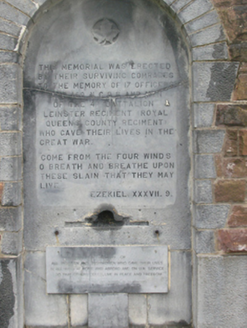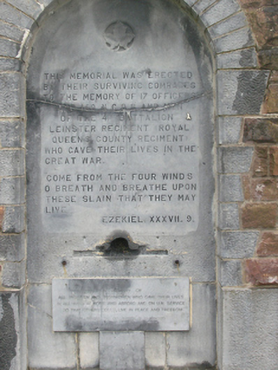 A memorial designed by Thomas Scully (1869-1946/7) commemorating '17 OFFICERS AND 160 NCOs AND MEN OF THE 4TH BATTALION LEINSTER REGEMENT (ROYAL QUEEN’S COUNTY REGIMENT) WHO GAVE THEIR LIVES IN THE GREAT WAR'. A later panel commemorates 'ALL IRISHMEN AND IRISHWOMEN WHO GAVE THEIR LIVES IN ALL WARS AT HOME AND ABROAD AND ON U.N. SERVICE'.