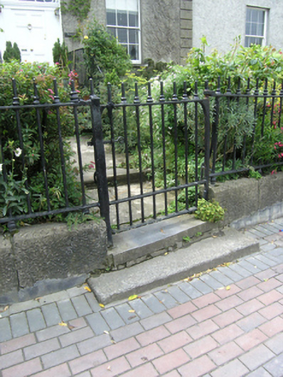 Mid-terrace two-storey over raised basement Late Georgian house, built c. 1810, with a two-storey return to rear. Slate roof with sky lights behind pararpet to front elevation, tall and wide rendered stacks on party walls and return gable, cast-iron rainwater goods to rear and return. Roughcast render to upper elevations, plat band continuous with first floor windows sills, raised stucco quoins to front and later smooth render to rear elevation and return, square-headed openings to windows with smooth render surrounds, segmental arched door case with original metal-framed petal leaf fanlight above wooden architrave and wide painted surrounds to door. Six-over-six timber sliding sash windows, an eight-over-eight window on return, six panel timber front door. Entrance approached by a flight of steps, set back from Coote Street with front garden bounded by cast-iron railings on a tall limestone plinth. Mews building to rear. Rear partly surfaced with cobbles and bounded by roughly coursed limestone rubble wall.