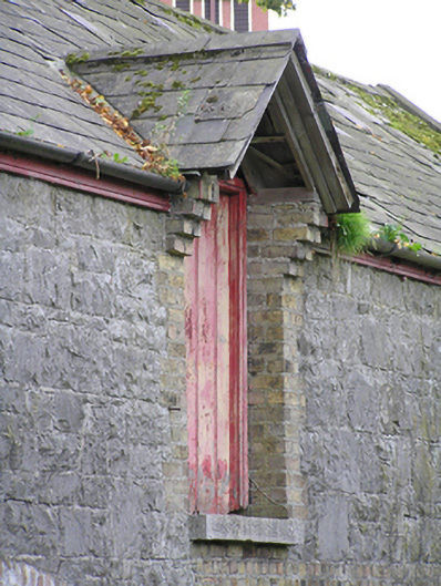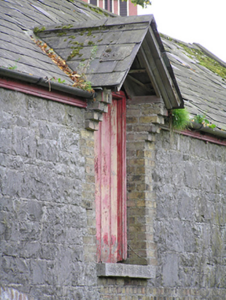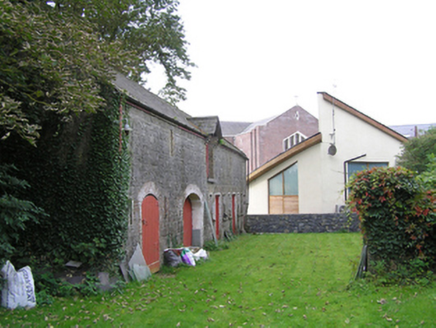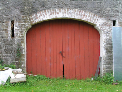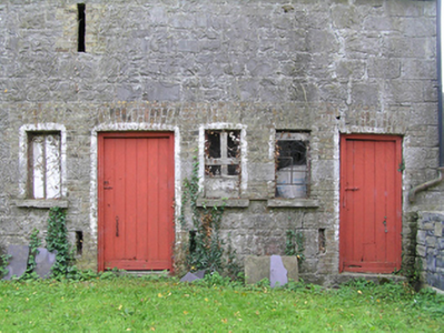 Detached multiple-bay lofted stone former coach house, built c. 1850, now in use as outbuildings. Pitched slate roof, black clay ridge tiles, central gable to loft opening, upvc gutter to timber fascia, cast-iron downpipes. Coursed rough-hewn limestone walling with yellow and red brick surrounds to window, door and loop openings, yellow brick corbels to loft gable, two ground floor openings with brick arches, flat arch brick heads to all other door and window openings. Vertically-sheeted doors, double doors to large arched opening and a half door below the loft opening, cast-iron windows.