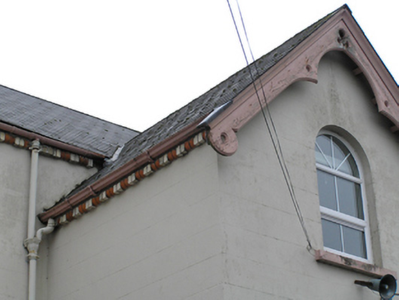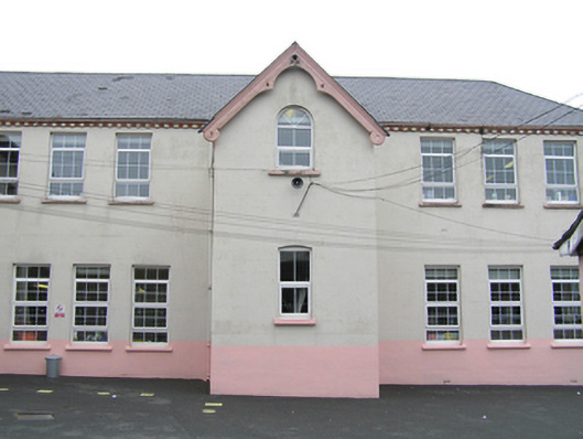 Attached seven-bay two-storey national school, built c.1880, with full-height gabled entrance hall, attached to rear of 1930s school (12505166). Hipped artificial slate roof, synthetic ridge tiles, ogee cast-iron gutter on red and yellow brick eaves course, cast-iron downpipes, decorative pierced bargeboard to entrance gable. Painted ruled-and-lined rendered walls. Square-headed window openings with concrete sills, round-headed window to first floor of entrance gable, segmental-headed to ground floor, segmental-headed door opening to west side of entrance gable; all with replacement uPVC door and overlight, and windows. Tarmacadam yard.