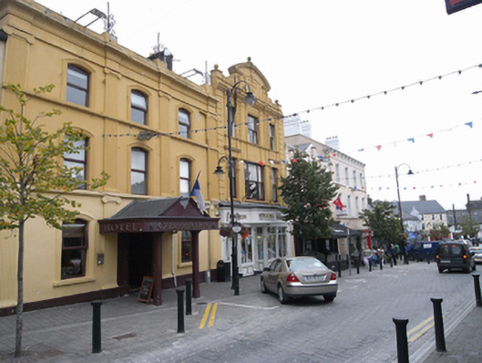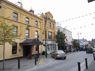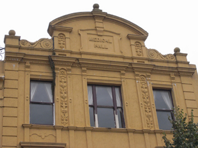 Attached three-bay three-storey commercial building, built c. 1910, with decorative façade and pedimented parapet, traditional-style timber shopfront c. 2000. Pitched roof hidden behind parapet wall with rendered chimneystack to west. Central segmental pediment with dentil open-based architrave surround on pair of squat pilasters within foliate panels. Central lugged-and-kneed panel with raised lettering "Medical Hall", having scrolled keystone rising through the pediment surmounted by ball-finial. Pediment is flanked by pair of large scrolled brackets flanked by squat piers and ball finial over. Elaborate dentil cornice below spans entire façade. Painted rendered walling with soldier quoins to either end, pair of pilasters to the second floor with decorative foliate panels. Scrolled corbels to cornice above. Square-headed window openings flanked by slender panelled pilasters and scrolled corbels supporting plain frieze-and-detailed cornice above. Moulded continuous sill course to second floor with decorative apron to rendered bays, concrete sills to first floor. Single-pane timber sash windows, tripartite to central bays. Traditional-style timber shopfront with fixed-pane display windows and panelled stall risers flanked by slender parallel pilasters and decorative corbels. Central recessed door opening and further door opening to west, both having timber panelled and glazed doors. Large timber fascia spanning shopfront with central projection with raised lettering.