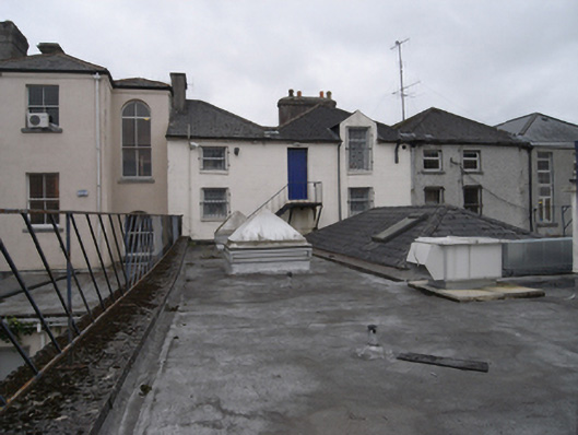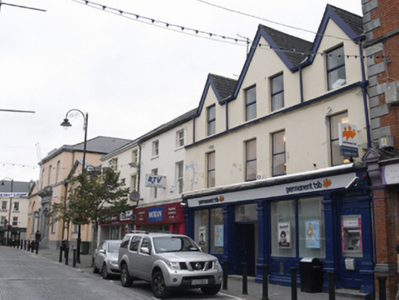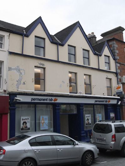 Attached four-bay three-storey three-gabled commercial building, built c. 1910, with shopfront inserted c.2000. Pitched artificial slate roof with gables rising from front elevation, further pair of hipped roofs to rear, clay ridge tiles with large rendered chimneystack with clay and terracotta pots to central valley, further rendered chimneystack to rear roof rising from east party wall, lucarne window rising from rear elevation. Timber fascia to three gables with replacement rainwater goods. Painted ruled-and-lined rendered walling. Square-headed window openings, painted stone sills, and replacement timber casement windows. Replacement timber shopfront with square-headed display windows, double timber panelled doors, timber pilasters and timber fascia. Aluminium windows to rear.