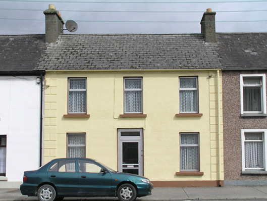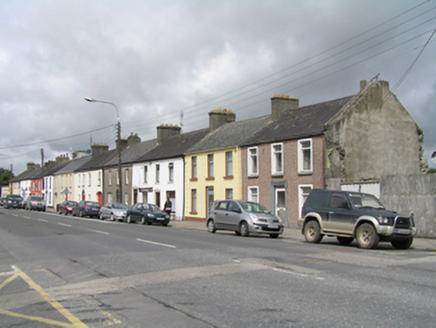 Terraced three-bay two-storey house, built c.1820. Pitched artificial slate roof, cement ridge tiles, shared rendered chimneystack with clay pots to either end. Cast-iron rainwater goods. Painted ruled-and-lined rendered walling, rendered quoins to either end and smooth rendered plinth course. Square-headed window openings, painted stone sills, and aluminium windows. Central square-headed door opening with aluminium glazed door.