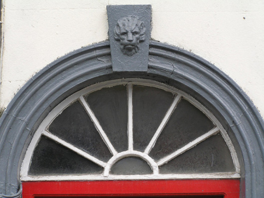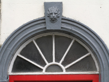 Terraced four-bay two-storey rendered house, built c. 1820, with integral carriage arch to east. Pitched natural slate roof, clay ridge tiles, rendered chimneystack to east and further rendered stack to west having moulded cornice and shared with neighbouring house, both having clay pots. Plastic gutter on timber eaves. Painted ruled and lined rendered walling, projecting smooth rendered plinth course and rendered soldier quoins to either end. Square-headed window openings and painted limestone sills. uPVC windows to both floors. Round-headed door opening, moulded architrave surround on limestone plinth blocks with lion's head keystone , replacement timber panelled door and timber spoked fanlight over. Depressed arched carriage opening to east bay with replacement vertically-sheeted timber doors .