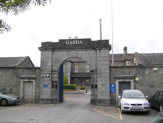 Attached limestone vehicular entrance, flanked by pedestrian gates, dated 1832. Round-headed voussoired limestone ashlar opening with impost mouldings and plinth course, flanked by pair of projecting piers all surrounded by plain stepped blocking cornice and parapet over. Replacement steel gates and chrome raised lettering to parapet block "GARDA". Squared limestone rubble walls to either side with flat-headed pedestrian gates with dressed ashlar surrounds with replacement doors.