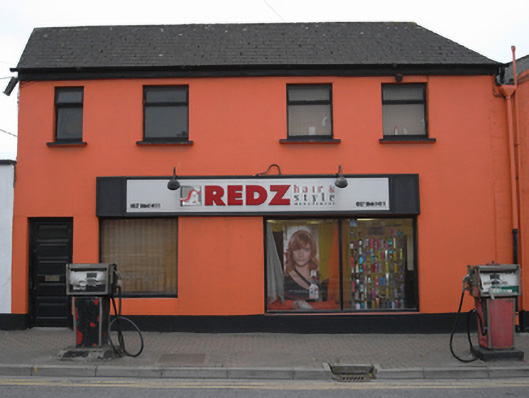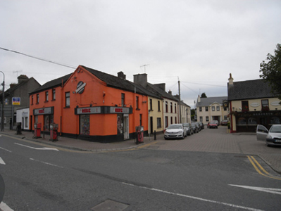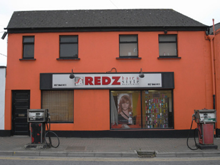Corner-sited end of terrace two-bay two-storey former house, built c.1850, with four-bay two-storey rear extension fronting onto Abbeyleix Road c.1960, in use as a commercial premises. Pitched artificial slate roofs, synthetic ridge tiles, cement coping, diminutive brick chimneystack to west, plastic rainwater goods and timber fascia. Painted ruled-and-lined rendered walling. Square-headed window openings, painted limestone sills, replacement timber casement windows, concrete sills to rear extension, single-pane timber sash window with convex horns, no sill and semi-exposed sash box. Fixed-pane display window to retail unit with uPVC glazed door, further fixed-pane display window to east gable with plywood box fascia spanning both shop windows to both elevations. Further pair of fixed-pane display windows to rear extension and timber panelled door. Three petrol pumps to pavement "Beckmeter" c. 1980 and hexagonal cast-iron stand, possibly an air pump c. 1950.