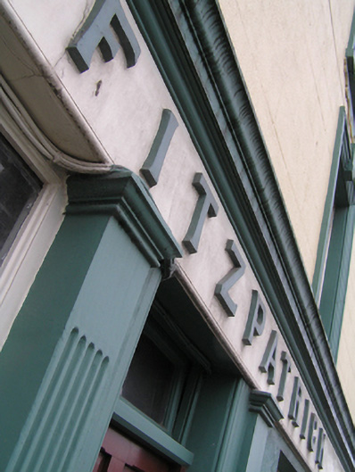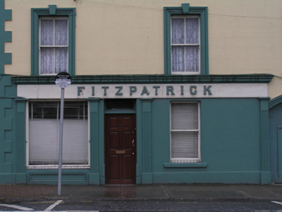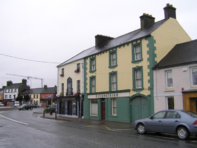 Terraced three-bay three-storey house, built c. 1810, with shopfront to ground floor and integral carriage arch, two-storey return. Pitched slate roof, clay ridge tiles, three rendered chimneystacks with clay pots. Ogee cast-iron rainwater goods on ogee corbels. Painted ruled-and-lined rendered walling with rendered quoins and smooth rendered plinth course. Square-headed window openings with architrave surrounds and painted stone sills. Keystones to first floor window surrounds. Decorative rendered aprons to second floor, and above carriage arch. Two-over-two timber sash windows with ogee horns throughout. Rendered shopfront comprising single fixed-pane display window above panelled stall-riser, single-pane timber sash window and central square-headed door opening with replacement hardwood panelled door and overlight. All openings flanked by fluted rendered pilasters on plinth blocks supporting rendered fascia with raised lettering and cornice stone. Segmental-headed carriage arch, with moulding to arch and diamond-faced keystone, flanked by pilasters on plinth blocks, double-leaf vertically-sheeted timber doors.