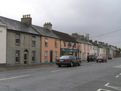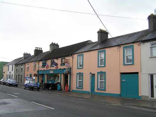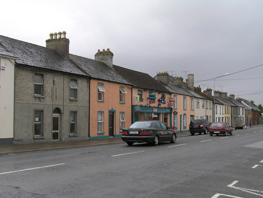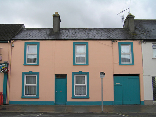 Terraced three-bay two-storey, built c. 1830, with integral carriage arch to west bay. Pitched slate roof, synthetic ridge tiles, two tall render profiled chimneystacks, one shared with adjoining house to the west, both with clay pots. Plastic rainwater goods. Painted ruled-and-lined rendered walling, smooth rendered plinth course. Square-headed window openings moulded render architrave surrounds and painted concrete sills, with decorative rendered keystones to ground floor. Replacement uPVC windows to both floors. Square-headed door opening, tongue and groove timber door with rectangular overlight. Square-headed carriage arch, tongue-and-groove timber door.