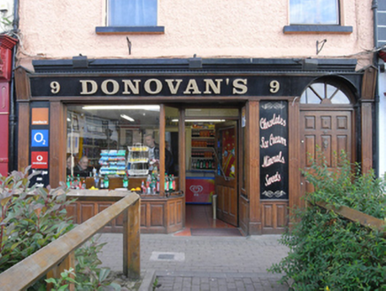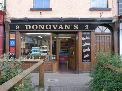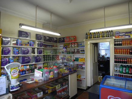 Terraced two-bay two-storey former house, built c. 1880, with shopfront inserted c. 1990. Pitched slate roof, terracotta ridge tiles, and tall shared rendered chimneystack to east. Steel gutter, cast-iron hopper and downpipe. Painted rough-cast rendered walling. Square-headed window openings, patent rendered reveals, painted stone sills, aluminium windows. Hardwood shopfront comprises fixed-pane display window and inset glazed timber panelled door on timber panels flanked by fluted pilasters with fascia over. Round-headed door opening to upper floor with replacement hardwood panelled door and fanlight. Earlier dentiled cornice visible above fascia. Limestone step to entrance to upper floor. Original plaster cornice and timber joinery to traditional-style shop interior.