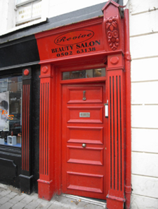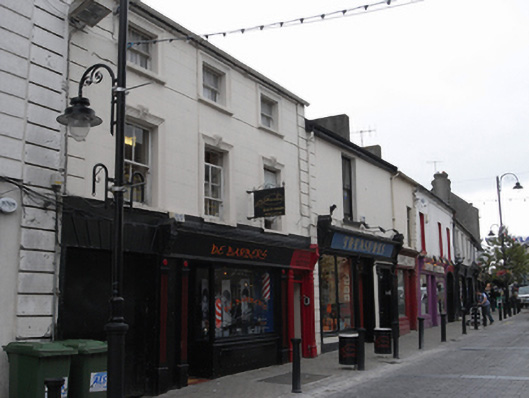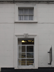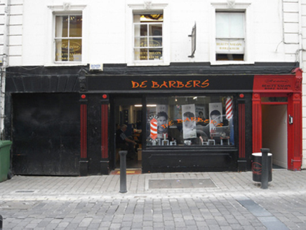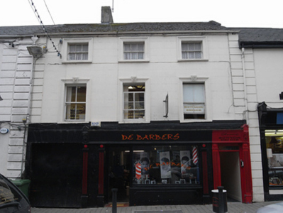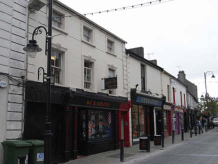 Terraced three-bay three-storey former house, built c. 1860, with integral carriage arch and inserted shopfront. Pitched artificial slate roof, cement ridge tiles, rendered chimneystack, metal gutter on iron brackets, cast-iron downpipe. Painted ruled-and-lined rendered walling, rendered soldier quoins to either end. Square-headed window openings, with moulded architrave surrounds, rusticated keystones to first floor and painted stone sills. Three-over-three timber sash window with convex horns to second floor, two-over-two timber sash windows with ogee horns to first floor. Shopfront comprises large fixed-pane display window on rendered stall riser, timber glazed door, square-headed door opening to west bay with panelled door c.1930, rectangular overlight. All openings flanked by fluted timber pilasters carrying timber fascia with pair of foliate console brackets. Square-headed carriage arch to east with rendered voussoirs, sheeted steel door and single limestone wheel guard.