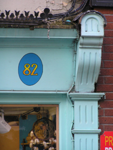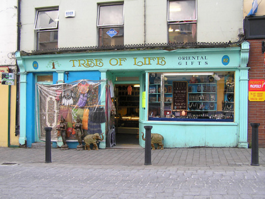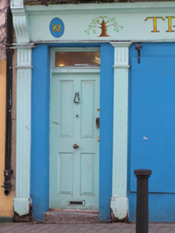 Terraced three-bay three-storey former house, built c. 1850, with original timber shopfront inserted c. 1910, in use as commercial premises. Pitched artificial slate roof, clay ridge tiles, shared brick chimneystack to east. Cast-iron rainwater goods. Painted ruled-and-lined rendered walling, square-headed window openings and painted stone sills, replacement aluminium windows. Timber shopfront spans entire ground floor comprising fixed-pane display window on timber sill and stall riser, flanked by fluted timber pilasters supporting timber fascia flanked by scrolled brackets having cast-iron decorative grille over, inset square-headed door opening with timber panelled and glazed door, rectangular overlight and terrazzo step, plain timber wall and further square-headed door opening with replacement timber panelled door and rectangular overlight.