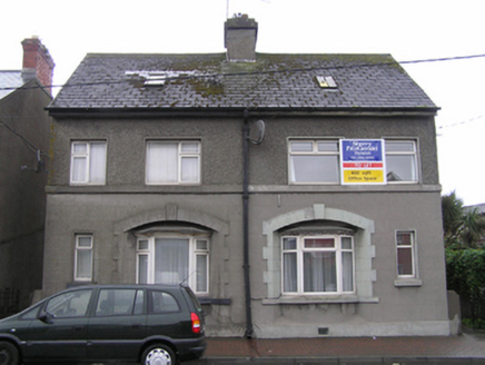 Semi-detached pair of two-bay two-storey houses, built c. 1940. Pitched artificial slate roof, clay ridge tiles, large shared rendered chimneystack, and replacement rooflight. Square-profile cast-iron gutter to both houses on timber fascia. Pebbledash rendered walling to first floor level, cement platband to first floor, smooth rendered plinth course. Square-headed window openings, patent rendered reveals and concrete sills, uPVC windows. Segmental-headed feature window openings with rendered quoins and keystone, inset three-sided canted bay felt roof and timber cornice. uPVC windows on concrete sill. Square-headed door openings to gables with replacement timber panelled doors and rectangular overlights. Small cement paved side area enclosed to street by rendered wall and decorative wrought iron gates to both sides.
