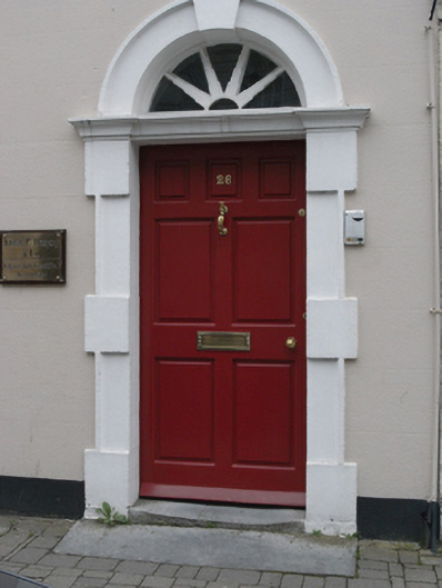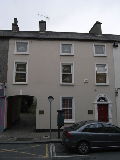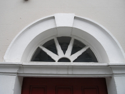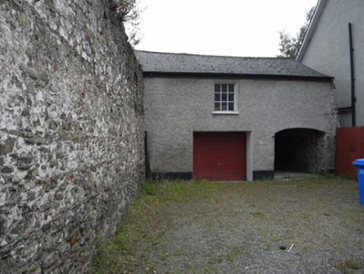 Terraced three-bay three-storey former townhouse, built c. 1820, with integral carriage arch, former coach house and modern extensions to rear, in use as commercial premises. Pitched artificial slate roofs, clay ridge tiles, two rendered chimneystacks, further two rendered stacks to rear roof. Replacement metal gutter to stone eaves. Painted ruled-and-lined rendered walling, square-headed window openings with later render architrave surrounds, painted stone sills, with concrete sills to ground floor, uPVC windows. Round-headed door opening with painted limestone ashlar block and start surround, spoked fanlight over lintel cornice with replacement timber panelled door and two limestone steps. Elliptical-headed carriage arch opening to south bay with painted keystone, stop chamfered reveals and replacement vertically-sheeted timber doors. Two-bay two-storey former coach house built c.1820 with pitched slate roof, pebbledash rendered walling, elliptical-headed carriage arch with a further square-headed vehicular opening. Yard enclosed to south by tall rubblestone boundary wall.