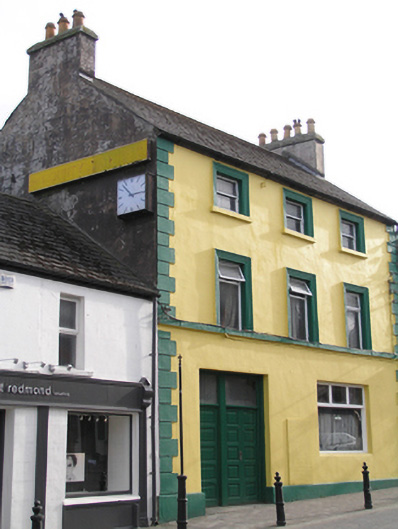 Terraced three-bay three-storey house built c.1810, with rear stone extensions c.1890 and corrugated iron extension c.1950, converted to a hotel in 1959, now vacant. Steep pitched artificial slate roof with clay ridge tiles, tall render stacks to gables with clay chimney pots, cast-iron rainwater goods to rear. Painted render wall with smooth render plinth and string course incorporating first floor window sills, raised stucco staggered quoins to the corners. Square-headed window openings reducing in size to the upper storey with moulded architraves and painted stone sills, smooth render surround to enlarged ground floor window and door opening, fixed uPVC window to ground floor, uPVC windows to first floor and one-over-one with ogee horns timber sliding sash windows to second floor, replacement doors within door opening with plain glazed rectangular overlight. Remains of plastic signage and clock to gable. The house fronts directly onto the street.