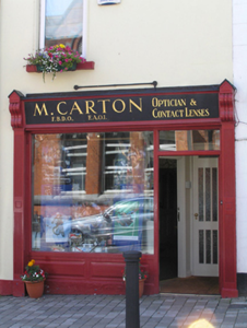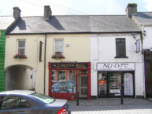 Terraced two-bay two-storey rendered house, built c. 1870, with timber shopfront c. 1990 and integrated carriage arch, single-storey return to rear, in use as commercial premises. Pitched artificial slate roof, black clay ridge tiles, rendered chimneystack, plastic rainwater goods. Painted rendered walling. Square-headed window openings, patent render reveals and painted stone sills, uPVC windows. Traditional-style timber shopfront with display window and glazed timber door flanked by fluted timber pilasters and gabled brackets with timber fascia. Elliptical-headed carriage arch to east bay with steel mesh gate and pair of stone wheel guards.
