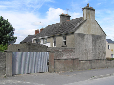 Attached two-bay two-storey house, built c. 1920, with front garden, single-storey extension to rear. Pitched artificial slate roof, terracotta ridge tiles, pair of rendered chimneystacks to either end with profiled capping and terracotta pots. Steel rainwater goods on timber fascia. Rough-cast rendered walling to all elevations, ruled-and-lined at attic level to south gable. Square-headed window openings, patent rendered reveals and concrete sills. Two-over-two timber sash windows with ogee horns. Square-headed door opening with smooth rendered surround, replacement timber panelled door and rectangular overlight opening onto concrete step and footpath. Front garden enclosed to road by elaborate painted cement rendered wall and moulded piers with domed capstones c. 1990 and steel gate. Further rendered wall along south gravelled lane with rendered piers and corrugated-iron gates to rear garden.
