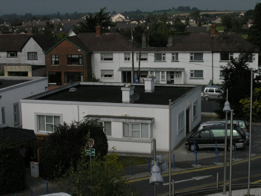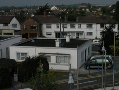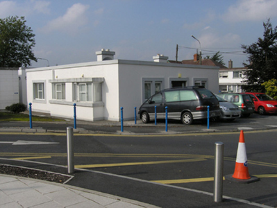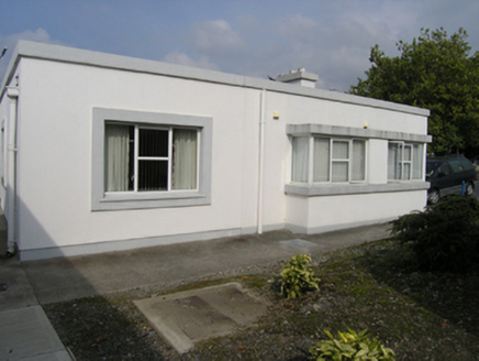 Detached three-bay single-storey, Modernist style gate lodge, built c. 1940, with box bay window to south elevation, located at main entrance to hospital complex, now in use as offices. Flat roofed, two rendered and painted stacks, cast-iron rainwater goods. Rendered painted white walls over a low painted plinth and a raised cornice over. Square headed windows and doors with raised stucco architrave surrounds, doorway and paired windows to entrance elevation. Replacement uPVC windows and doors.